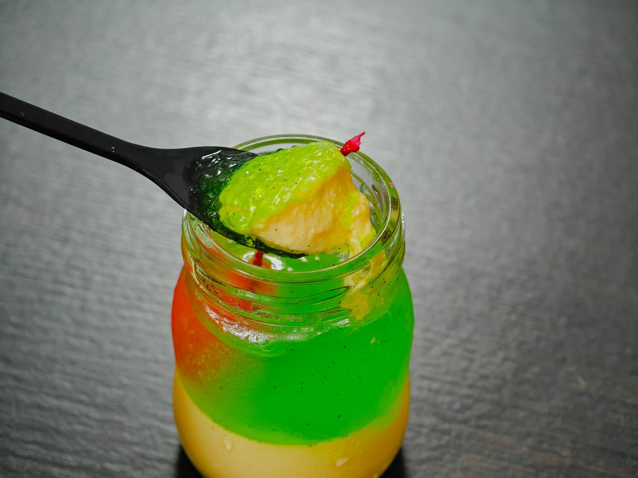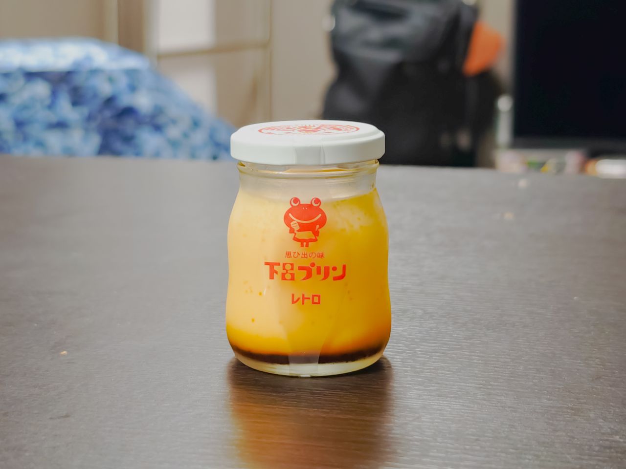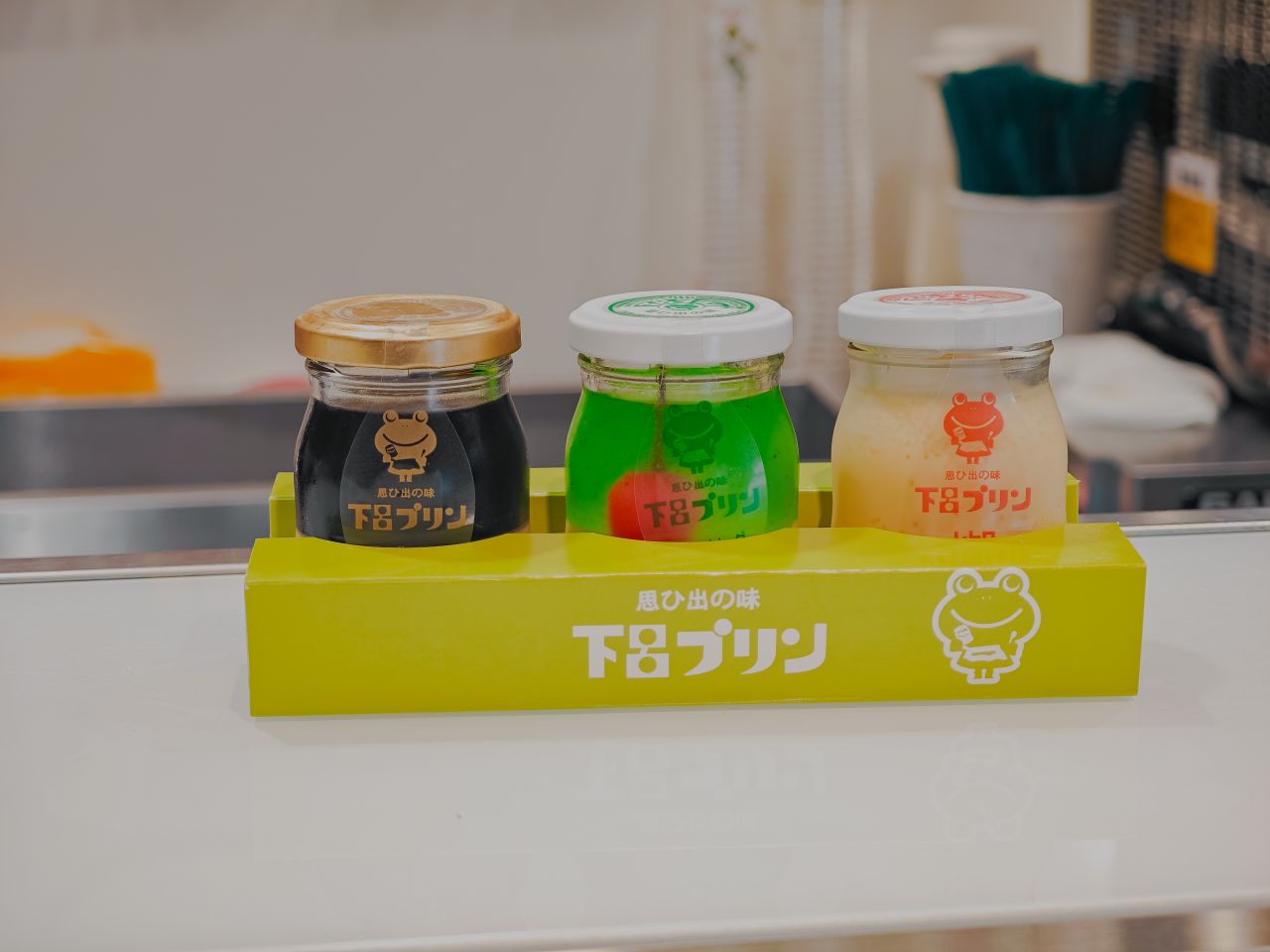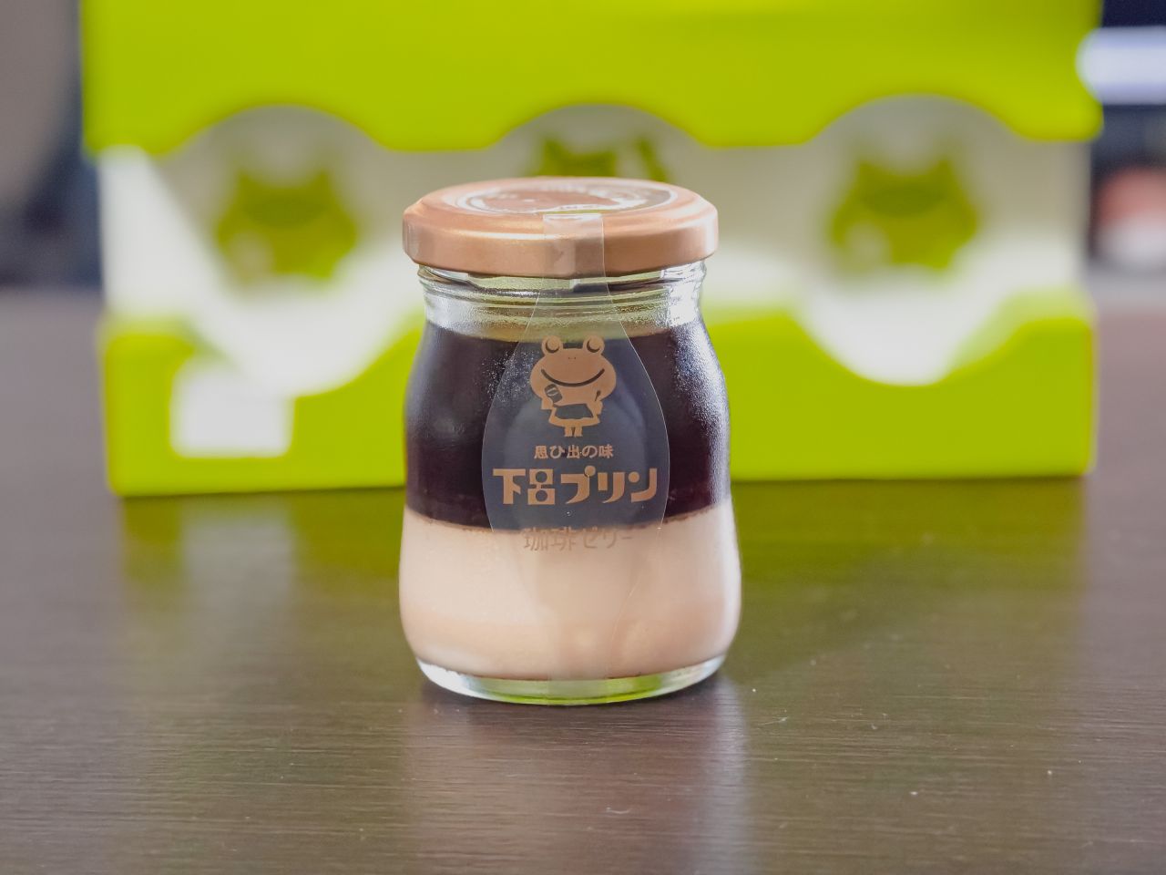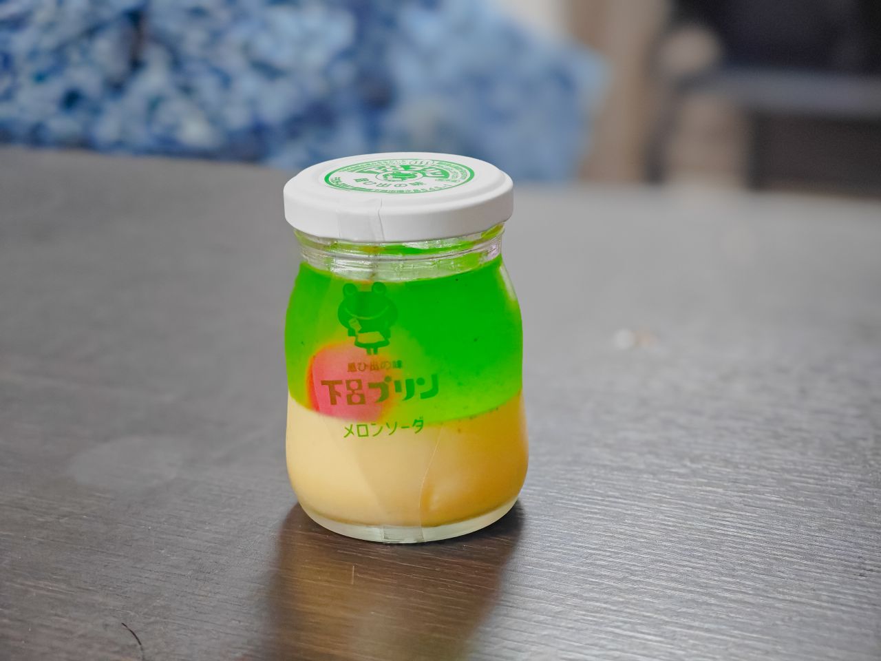 定番のプリンの上にメロンソーダのゼリーと2層になっています。下呂のカエルの親和性からも、下呂プリンといったらこれな感じ。