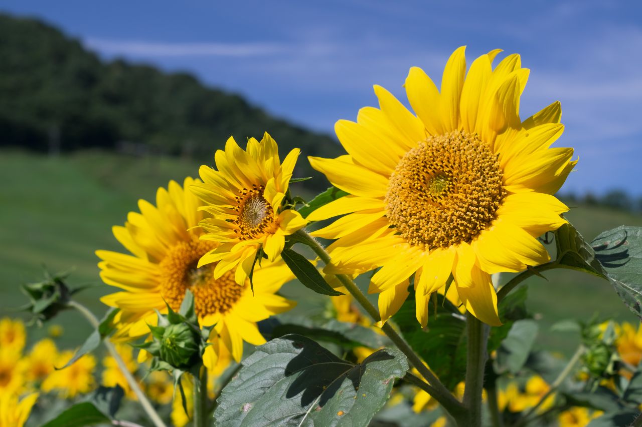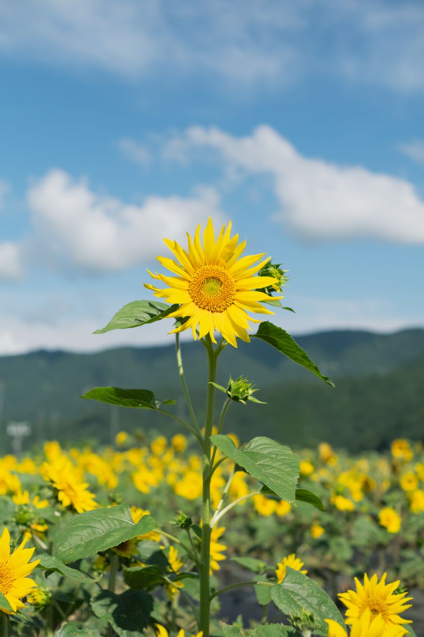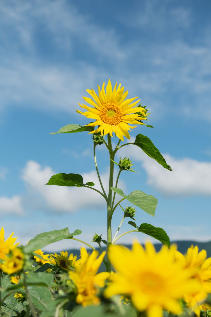 奥飛騨なので真夏でも若干涼しいけど、やはり太陽が照りつけているときついです。しかしそのおかげで、向日葵がみんな上を向いてくれるので写真映えは良くなりますね。