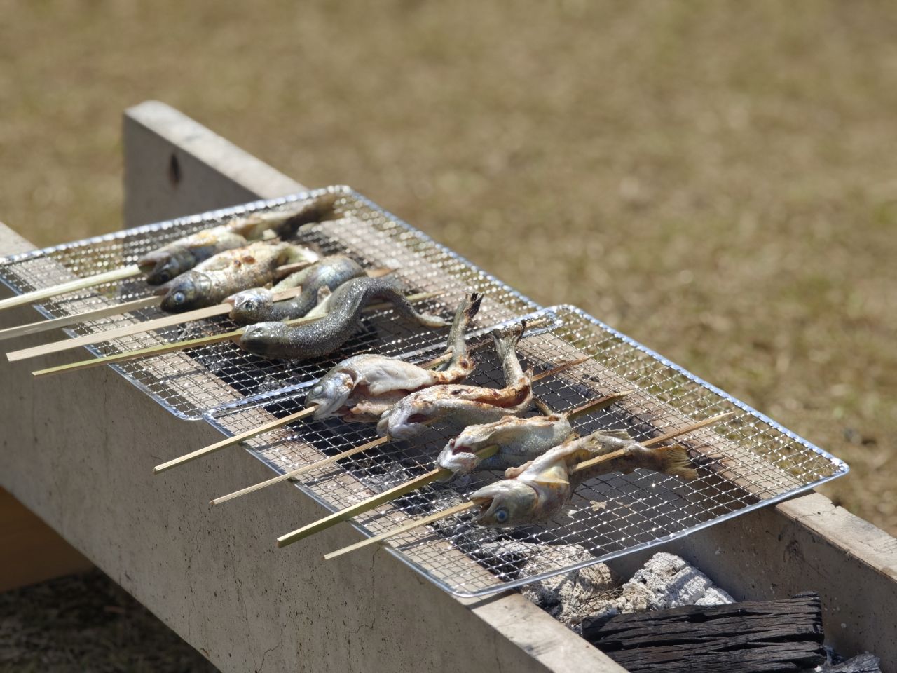小学生以下限定のイベント。清流白川に放流されたマスをつかみ捕りして、炭火で塩焼にする体験。一人2匹まで捕まえてOKで、捕まえられなかった子には1尾プレゼントされるようです。
