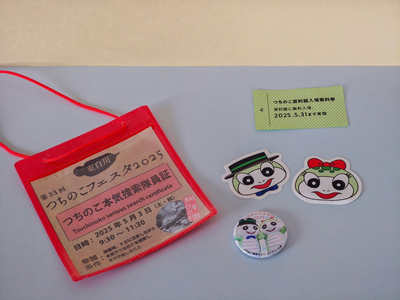 銅賞はつちのこフェスタ実行委員会公認キャラクター「つっちー&のこりん」のステッカー。缶バッジはスタンプラリー全制覇景品です。