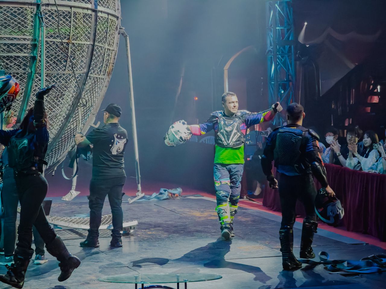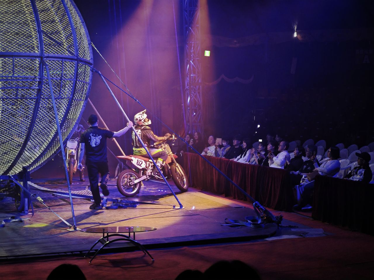 金属の巨大な球体の中をバイクでぐるぐると走りまわり、徐々に2台3台と同時走行をしていく。バイクの排気音と排ガスがテント内に充満して、緊張感高まる瞬間でした。