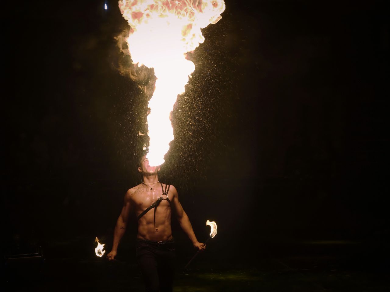 見た目にも華やかで、ときどき炎の熱気が感じられる圧巻のパフォーマンス。口に含んでいるものが何かを知りたい。